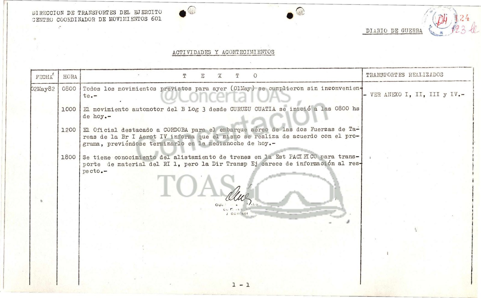 porte de material del RI 1, pero la Dir Transp Ej carece de información al res