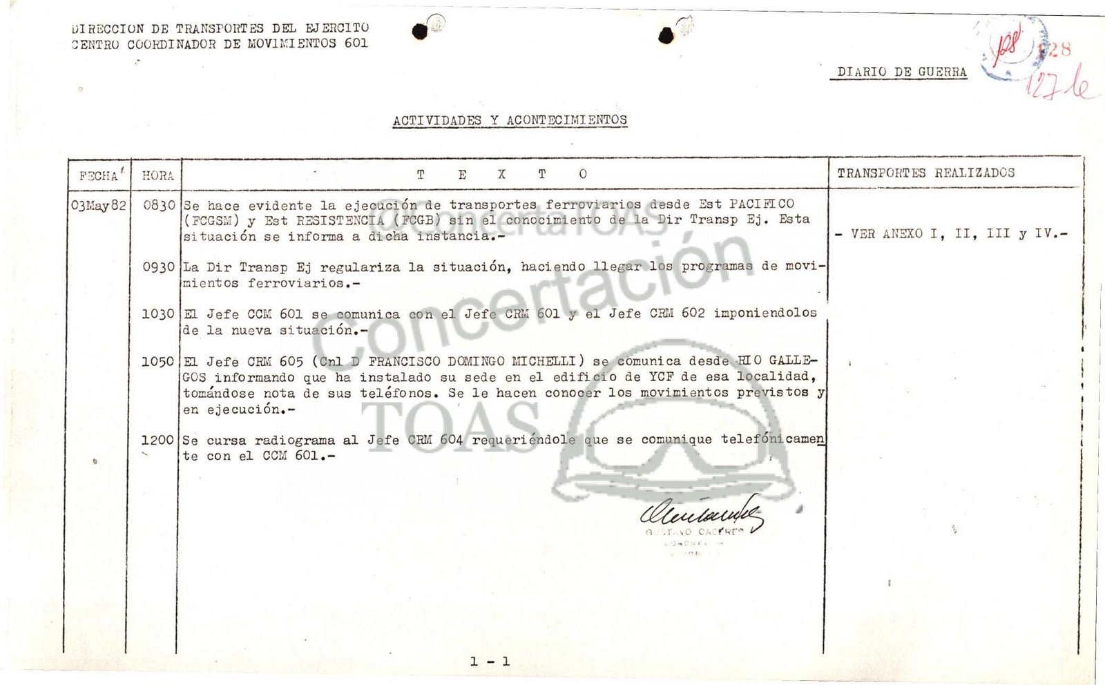 El Jefe CRM 605 (Cnl D FRANCISCO DOMINGO MICHELLI) se comunica desde HIO GALLE- a