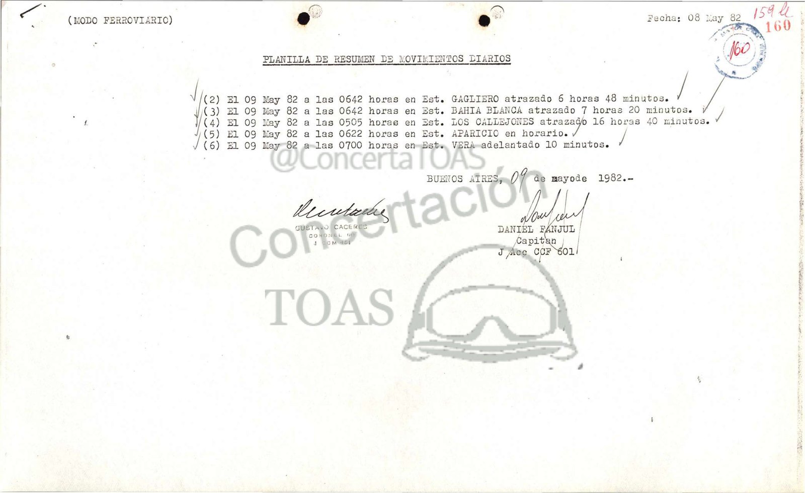 de El 09 Nay 82 a las 0642 horas en Est. GAGLIERO atrazado 6 horas 48 minutos. /