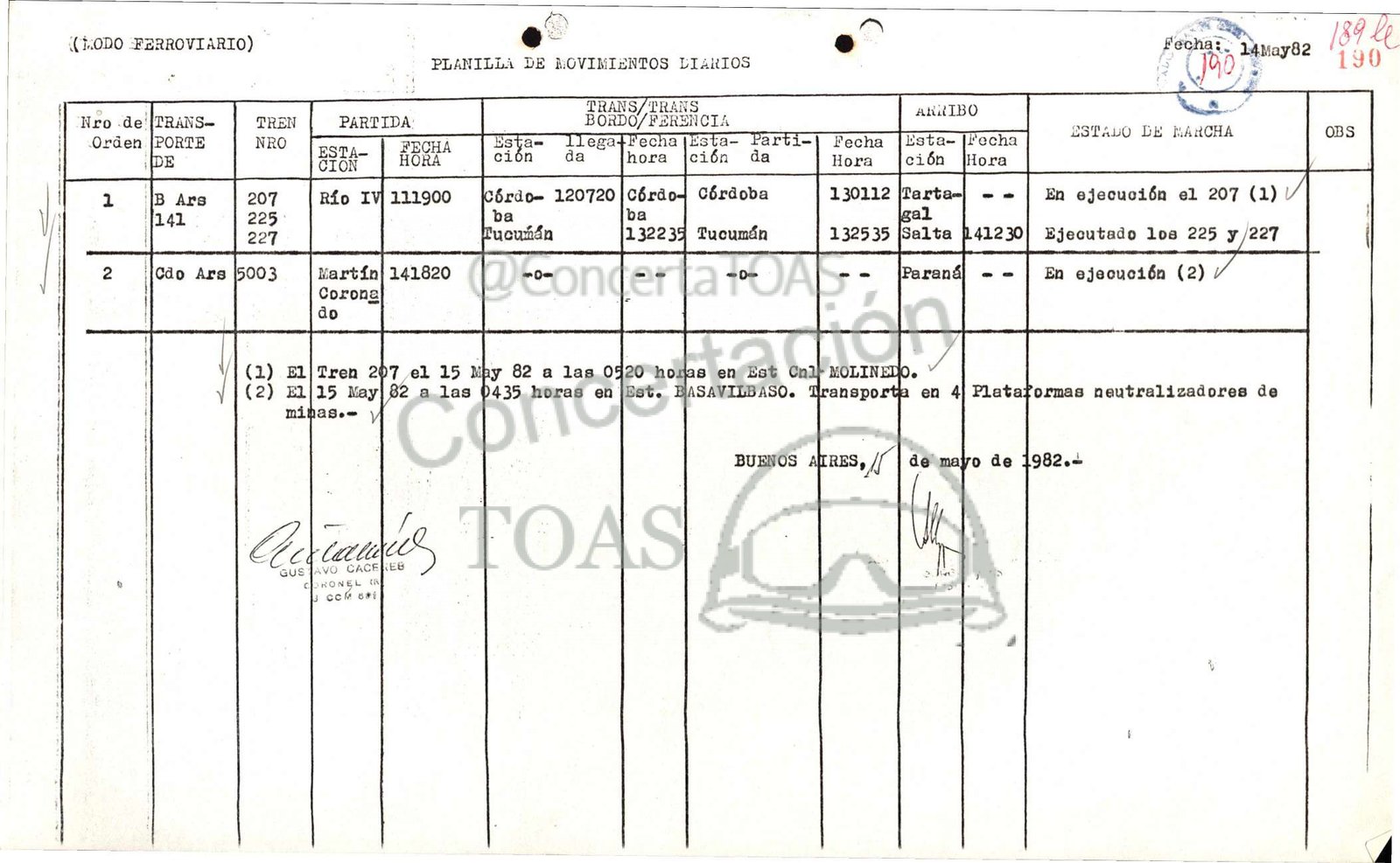 / (1) El|Tren 207 el 15 hy 82 a las 0420 hoxdas en Est Cnlf MOLINENO. /