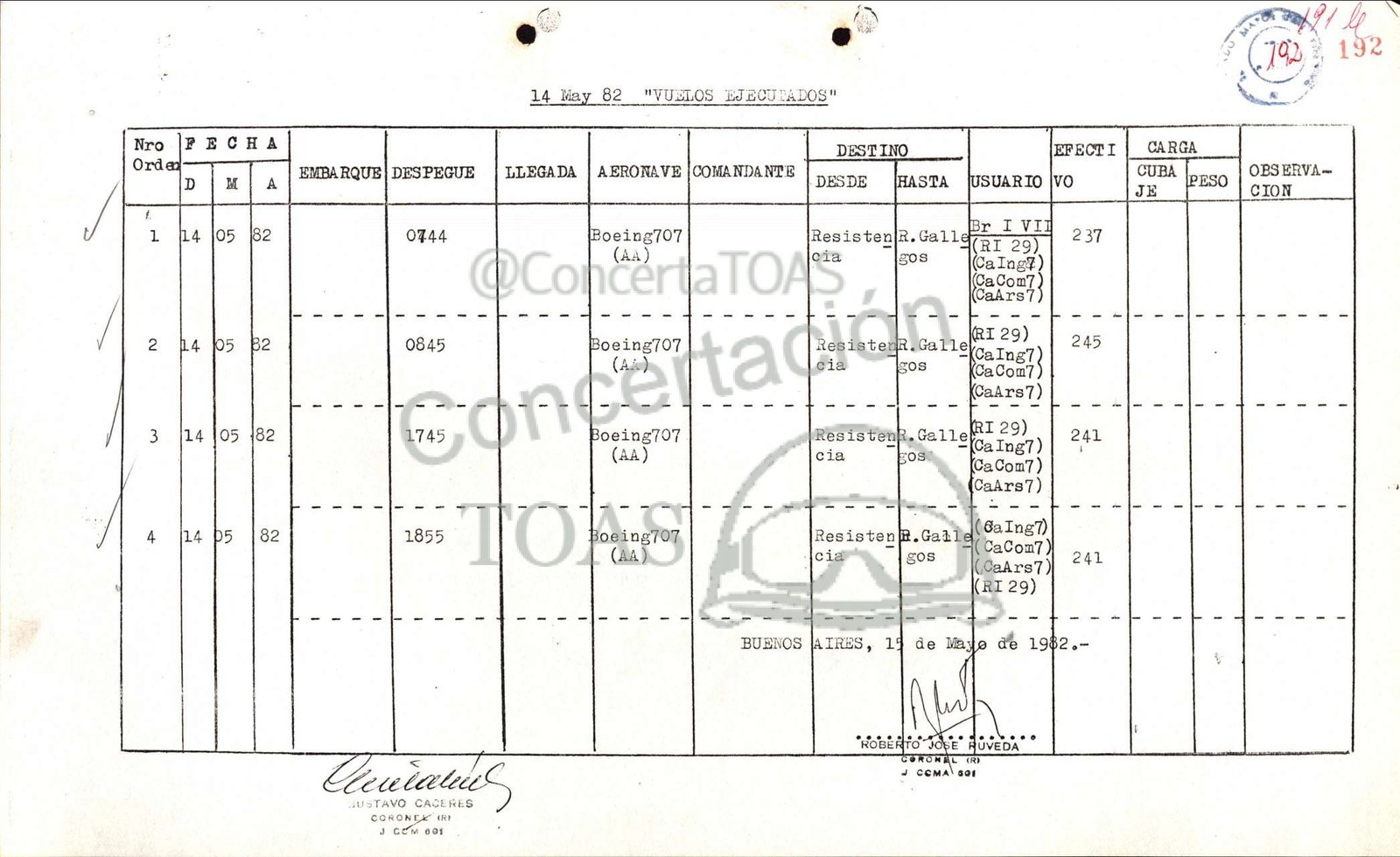 Ñ <= p Coca bceletos usTAVO CACERES CORONEL 16 y cóm 00s DA EN e Má 14 May 82 "VUZLOS EJECUIADOS" LLEGADA | AERONAVE [COMANDANTE | Boeing707 (Ar) Boeing707 (45) Boeing707 (44) Boeing707 (44) BUENOS OBSERVA CION .Galle “Los —[aIng7 ) J Ccemal aos