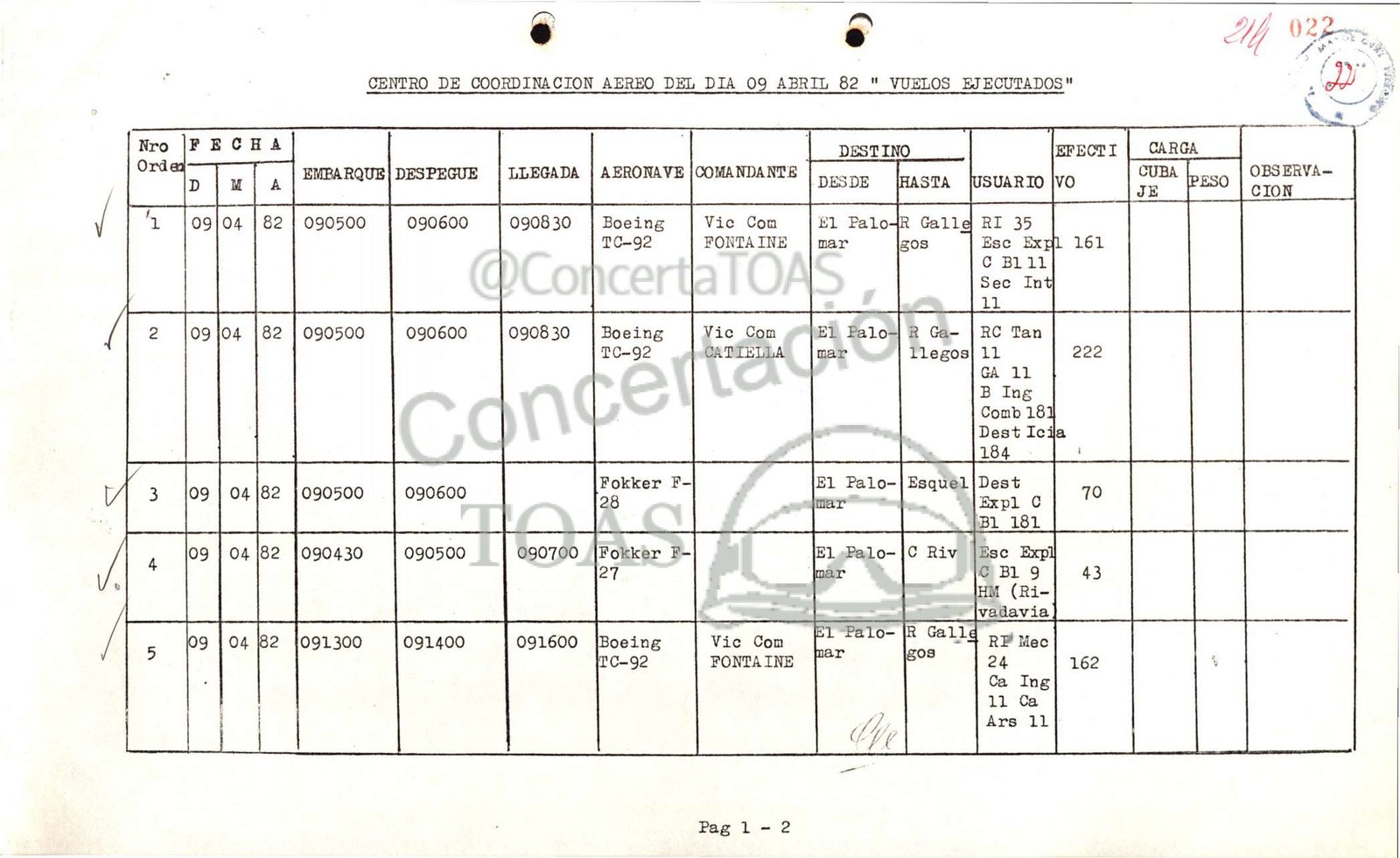 CENTRO DE COORDINACION AEREO DEL DIA 09 ABRIL 82 " VUELOS EJECUTADOS" Y