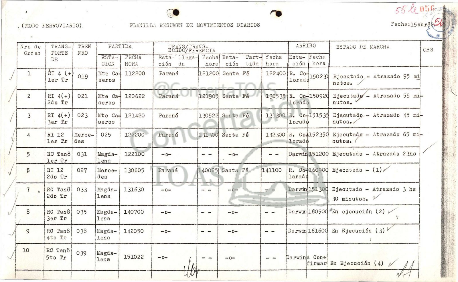 | . (MODO FERROVIARIO) PLANILLA HESUMEN DE MOVIMIZNTOS DIARIOS » Fecha:15Abr92»-