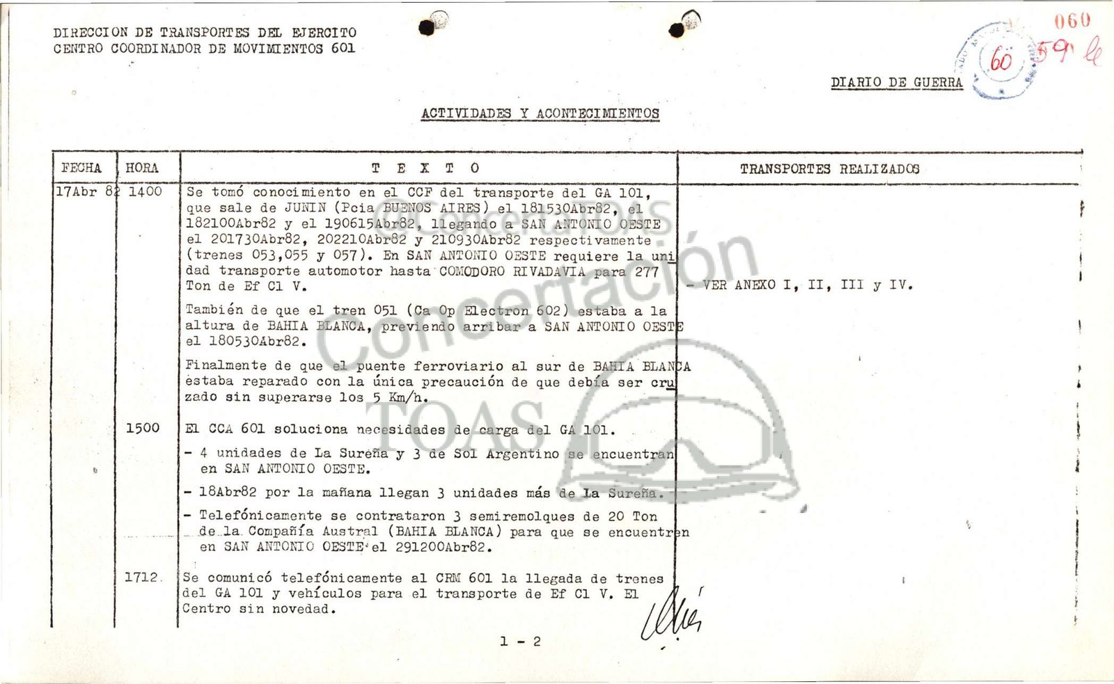 182100Abr82 y el 190615Abr82, llegando a SAN ANTONIO OESTE