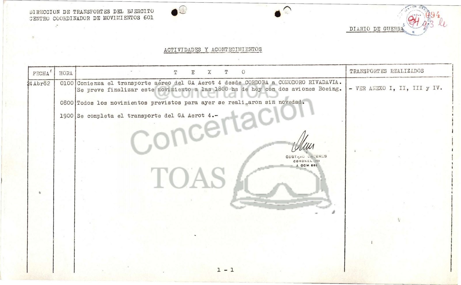 0100|comienza el transporte aéreo del GA Aerot 4 desde CORDOBA a CONODORO RIVADAVIA.