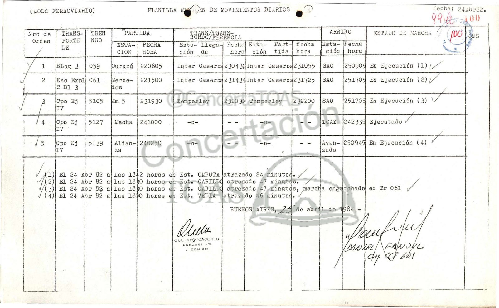Y El 24 Abr 83 allas 18B0 horas Est. CABILDO atredado 47 minutds, E a enganchado] en Tr 061 A